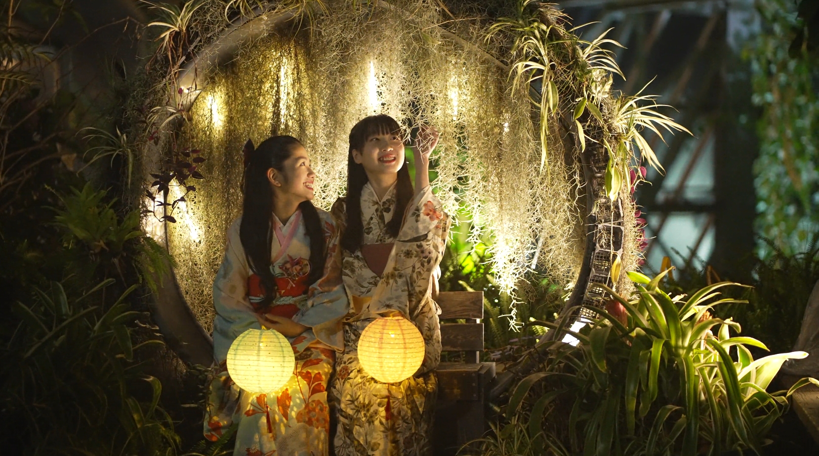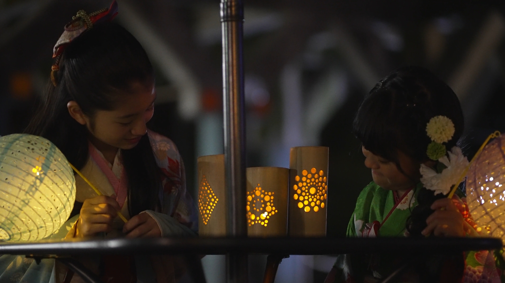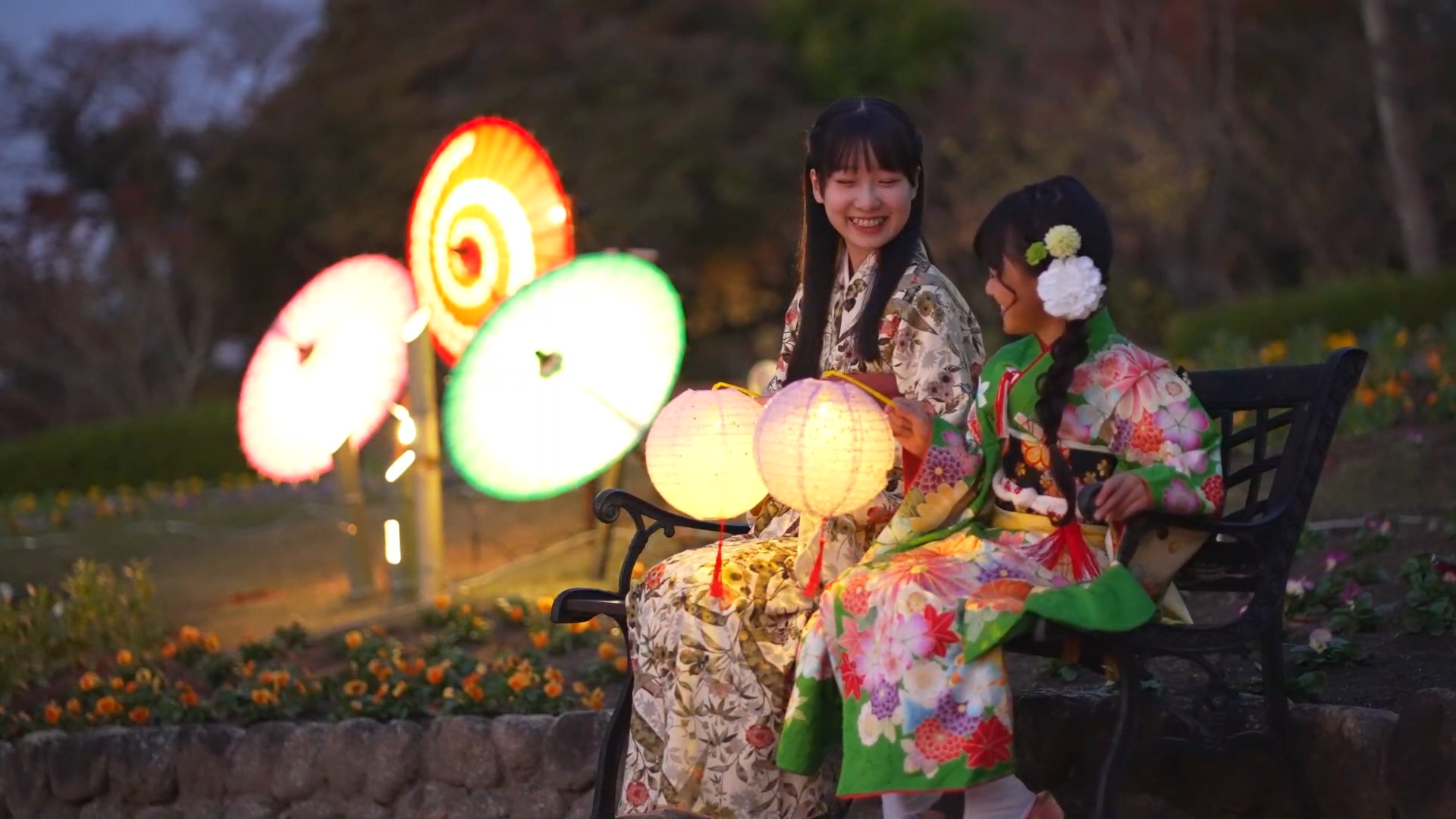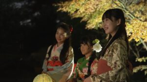 11月29日30日の二日間限定で催された夜のライトアップでは、美しい紅葉と竹や傘をモチーフにした落ち着いたデザインの灯篭が登場し、秋の植物たちの違った一面を演出していました。